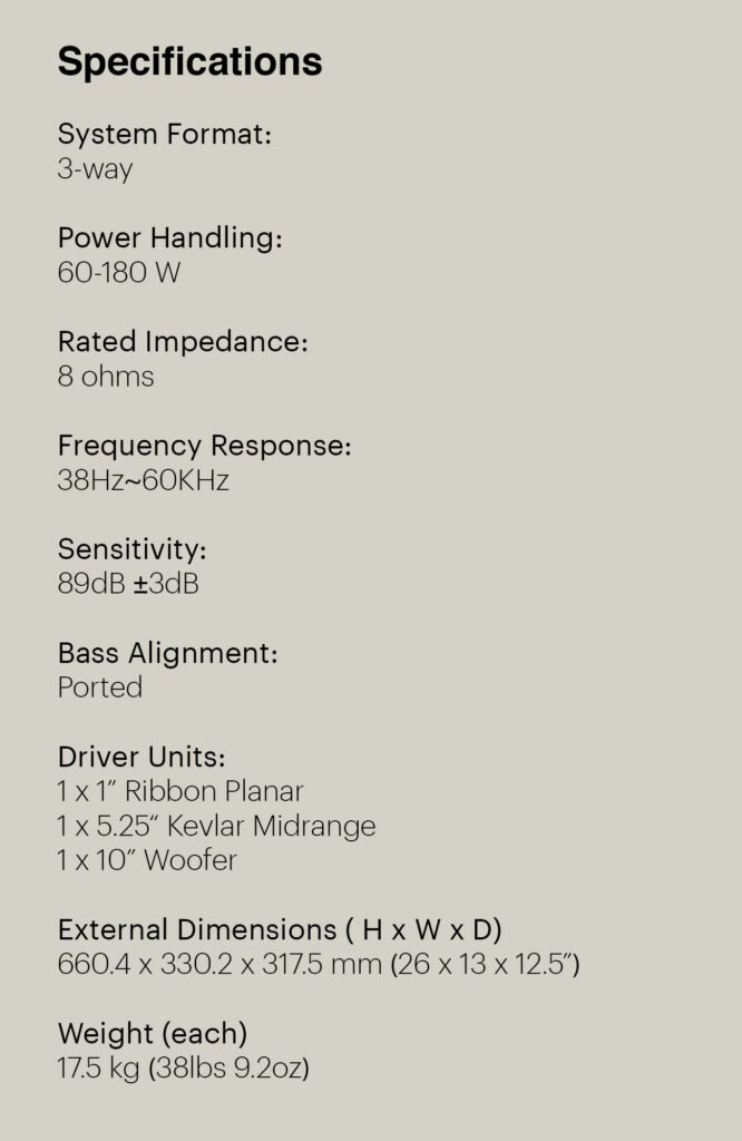 The Vintage 100 incorporates substantial speaker components engineered to reproduce a broad frequency range with accuracy and depth. Its configuration includes a powerful 10-inch woofer for commanding low-end output, a dedicated 5.25-inch Kevlar midrange driver for articulate vocals and instrumentation, and a 1-inch ribbon planar for exceptionally detailed high frequencies. Together, these elements deliver a cohesive and enveloping soundstage across the full spectrum.